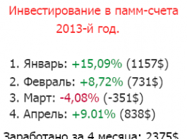 Звичайно ця зведена табличка дає вам мало інформації про зміну портфеля впродовж місяця, але ж воно вам і не треба? ? Все що потрібно знати, це те, що экперимент триває, ще придивляюся до forex компанії Alpari, яка якщо не помиляюся ввела можливість довірчого керування однією з перших. Але от щоб вкластися в Альпарі, якось не зрослося поки, хоча памм-рахунків там в рази більше, але серйозних рахунків, від мільйона доларів лічені одиниці. Так що поки щільно співпрацюю з форекс-тренд, ну а щоб в листопаді було ще веселіше, закинув туди ще 300$. Тепер загальна сума інвестованих мною коштів в памм становить 3500$, ну а за фактом 4014$. На мій погляд, для хорошої диверсифікації навіть цієї суми замало, потрібно мати хоча б 5к. Втім у кожного своя стратегія. Якщо хтось ще не має особистого досвіду в інвестуванні і є бажання спробувати, дерзайте, ось вам заповітна посилання на реєстрацію.